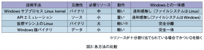 しかし、含まれていないソフトウエアが開発に必要な場合、そのWindows版を用意できるかどうかが問題になります。また、Windowsアプリケーションの集合体でしかないので、この環境でLinuxバイナリを動かしたり、ソースコードを再構成したりできないため、互換性はせいぜいスクリプトや設定ファイルなどデータレベルにとどまります。
