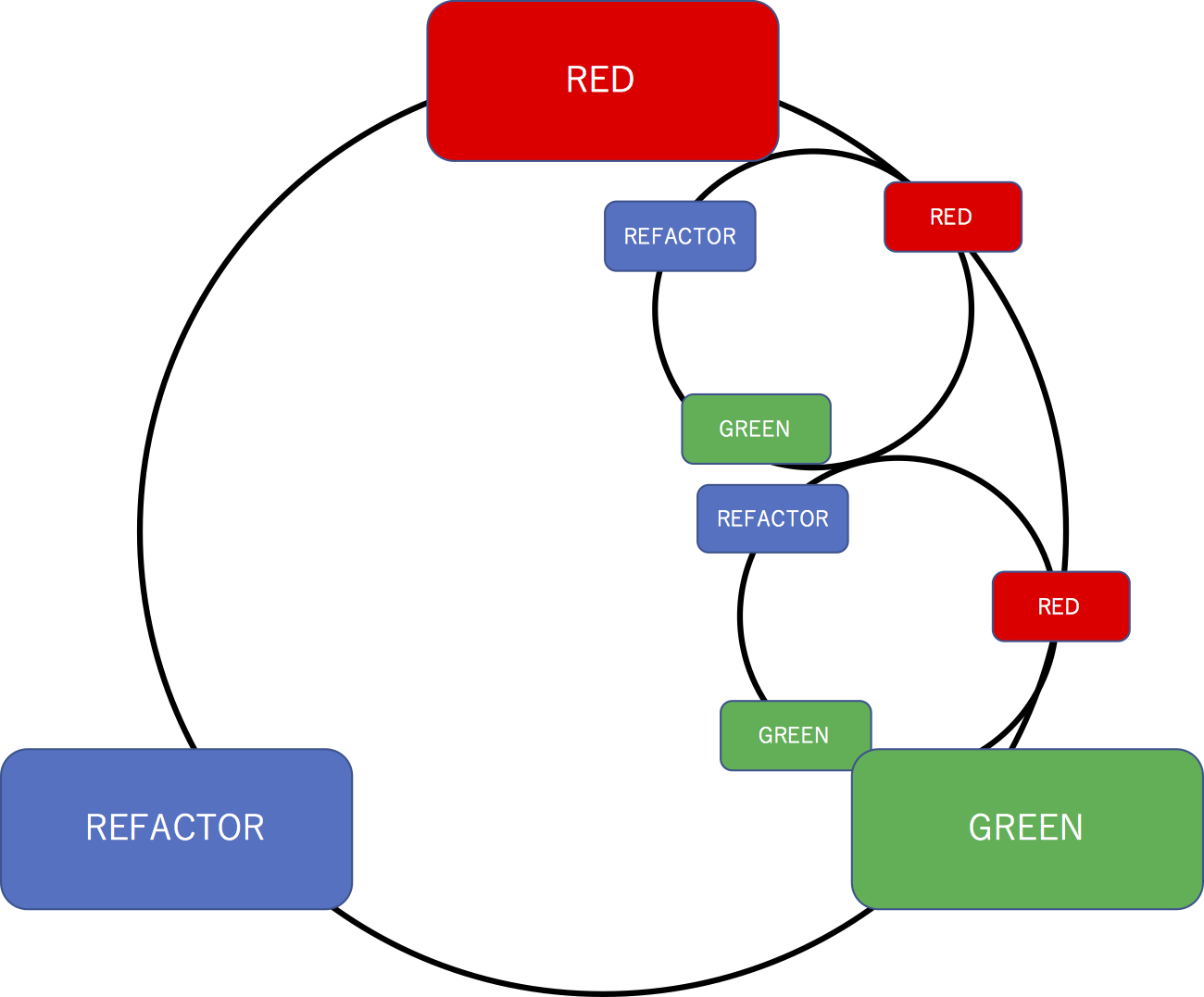 - 内部的により良い実装があればテストコードがすべて成功している状態のままで書き換える:リファクタリング
