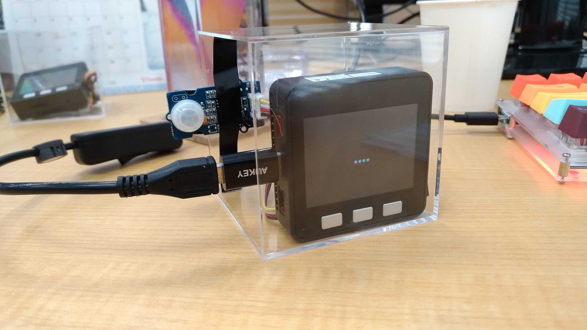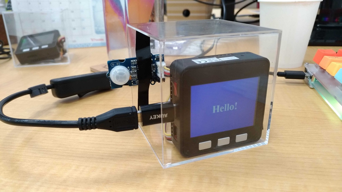 書き込みが完了したら、M5Stackの電源をONします。USB type-cケーブルを接続すると自動的に電源がONになります。電源がONにならない場合は電源ボタンを1回押してみてください。人感センサーの目の前で人が動くと、LCDディスプレイに「Hello!」と表示されるはずです。