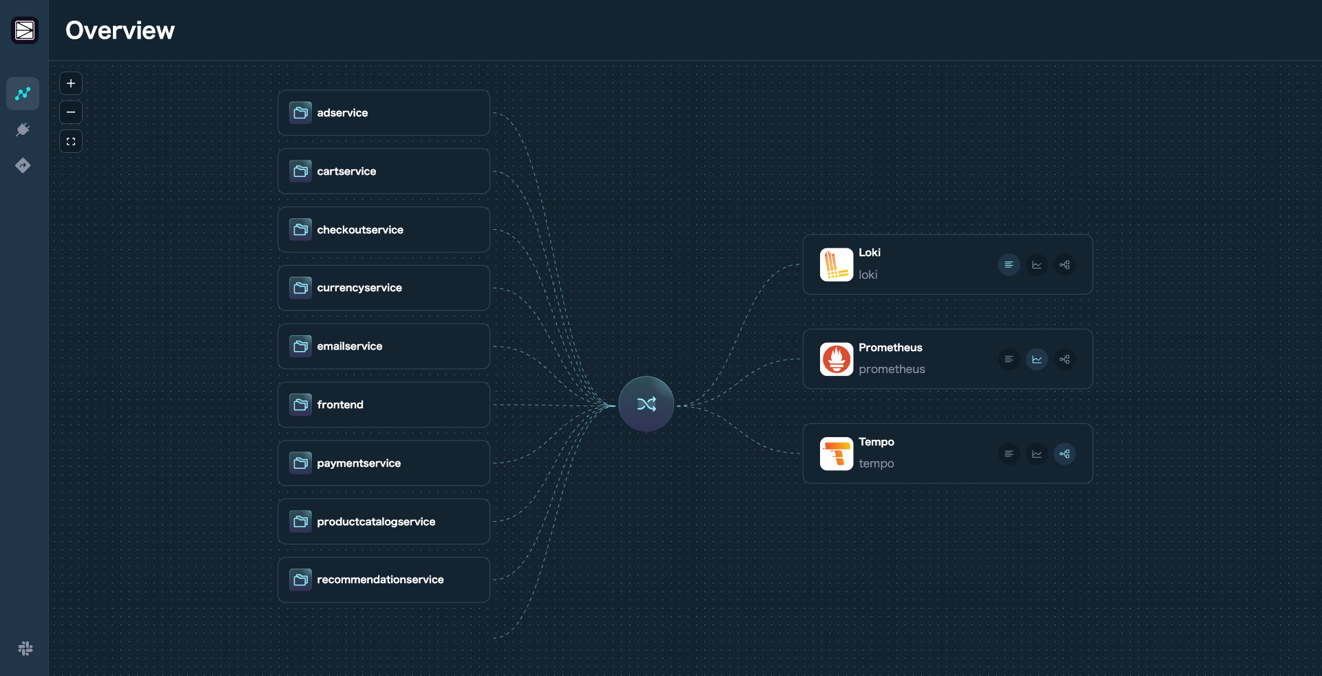 kubectl get pos -n observability NAME READY STATUS RESTARTS AGE observability-grafana-696488b9d9-7nf6d 1/1 Running 0 88s observability-loki-0 1/1 Running 0 88s observability-prometheus-server-6c65777696-9mmkh 2/2 Running 0 88s observability-tempo-0 2/2 Running 0 88s